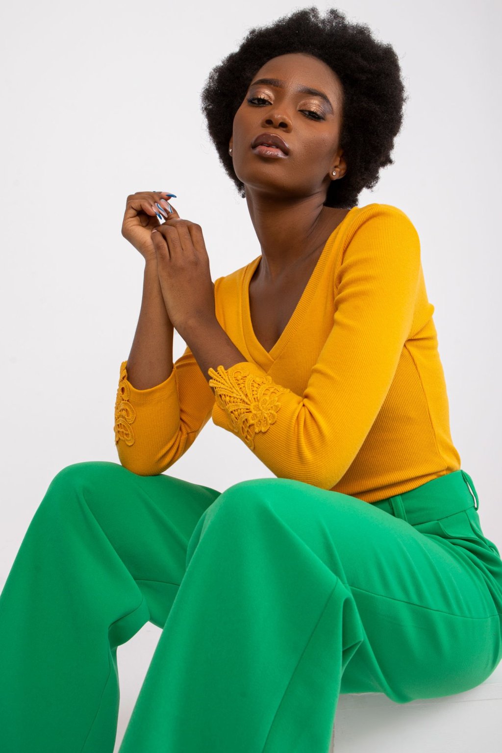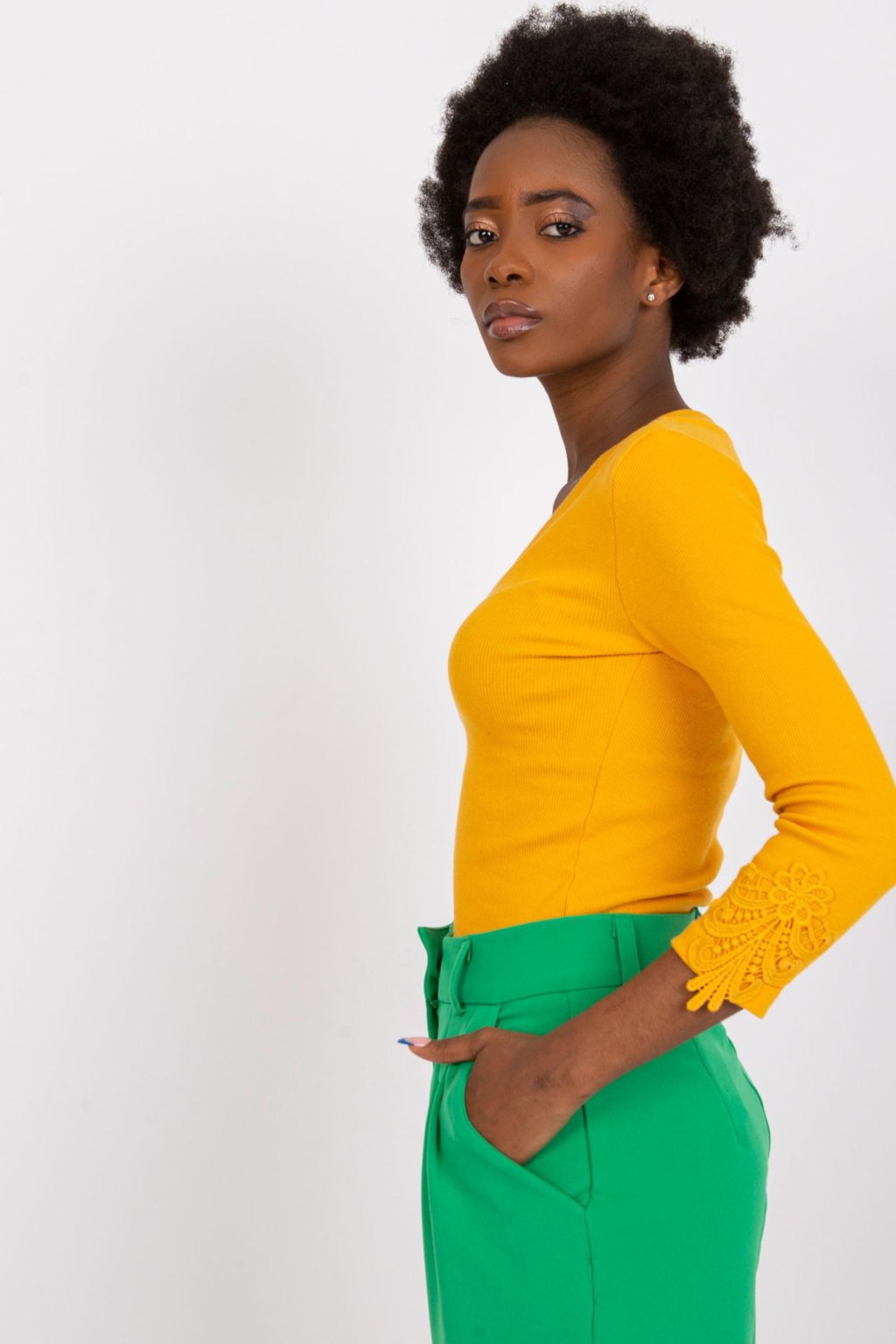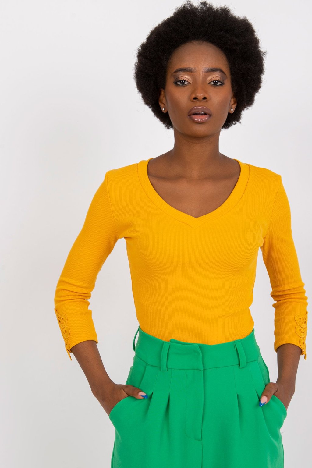 Modelka má na sobě velikost S. Míry modelky: výška 162 cm, prsa 80 cm, pas 63 cm, boky 80 cm.