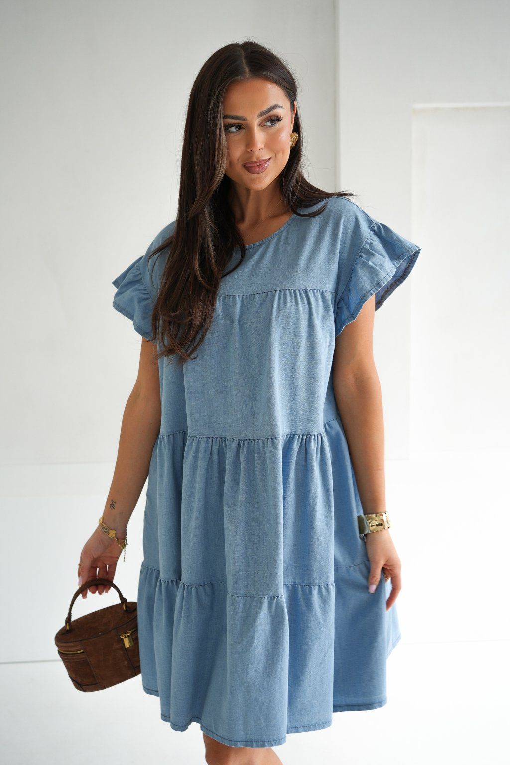 Letní šaty volnějšího střihu v džínovém vzhledu, které spojují pohodlí a ženský styl.