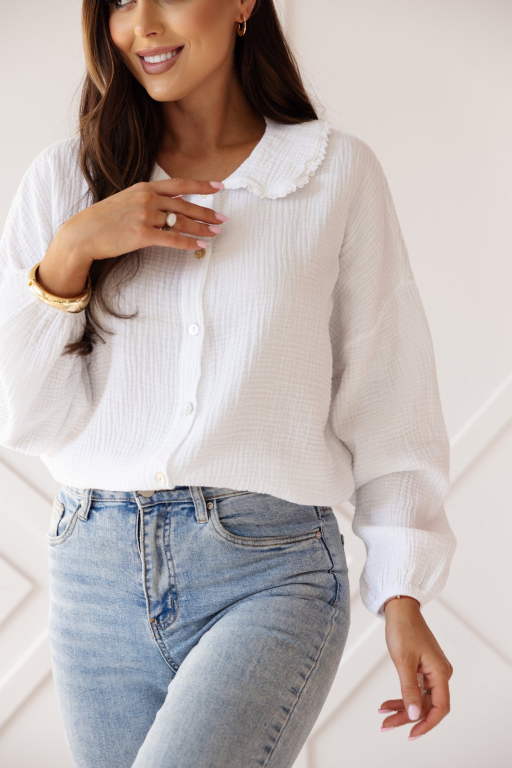 Lehká a pohodlná košile ze 100% bavlněného mušelínu. Díky volnějšímu střihu je příjemná na nošení a skvěle se hodí na jaro i léto. Romantický límeček dodává košili jemný ženský nádech. Mušelín je jemný, příjemný a vzdušný materiál, který si zamilujete.