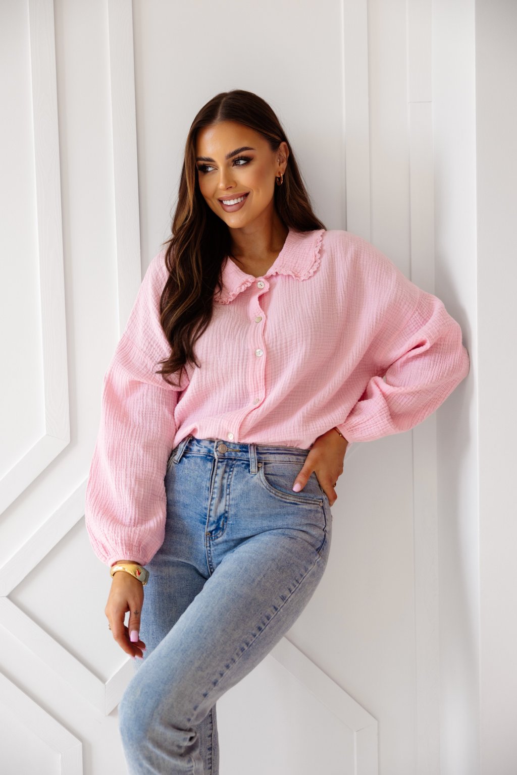Lehká a pohodlná košile ze 100% bavlněného mušelínu. Díky volnějšímu střihu je příjemná na nošení a skvěle se hodí na jaro i léto. Romantický límeček dodává košili jemný ženský nádech. Mušelín je jemný, příjemný a vzdušný materiál, který si zamilujete.