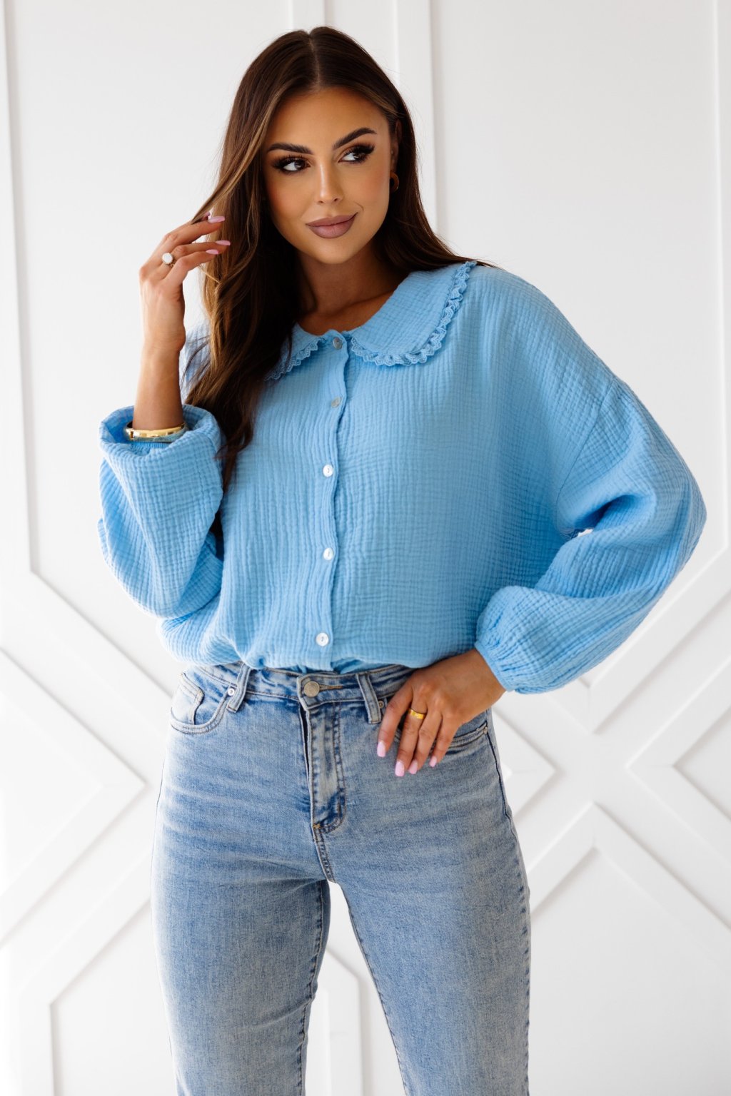 Lehká a pohodlná košile ze 100% bavlněného mušelínu. Díky volnějšímu střihu je příjemná na nošení a skvěle se hodí na jaro i léto. Romantický límeček dodává košili jemný ženský nádech. Mušelín je jemný, příjemný a vzdušný materiál, který si zamilujete.