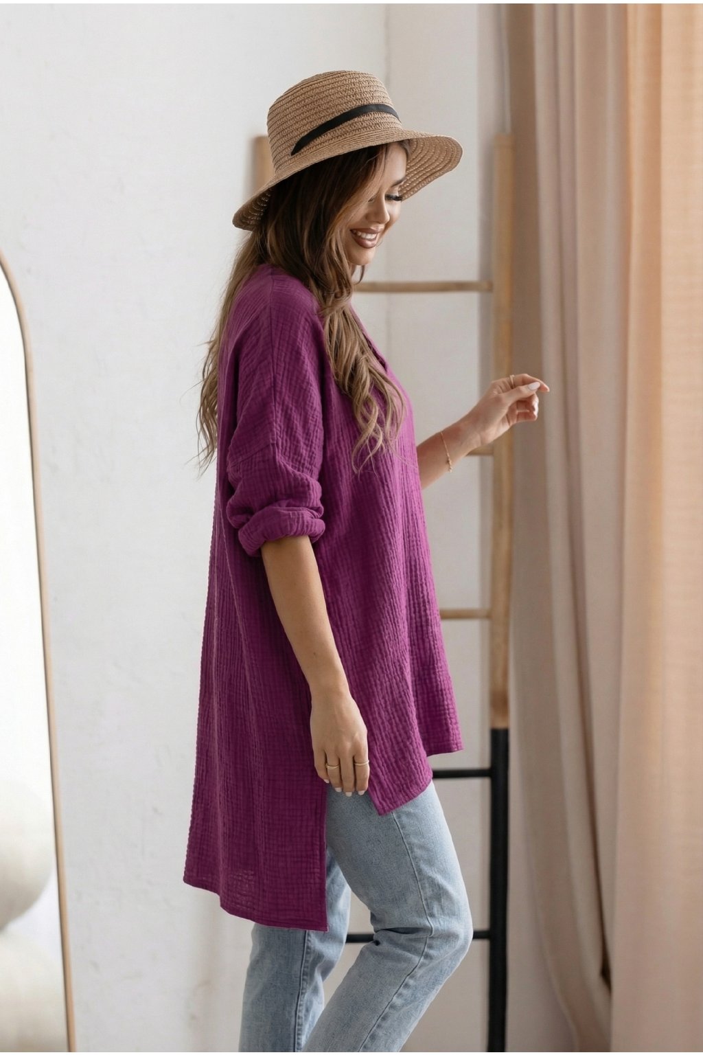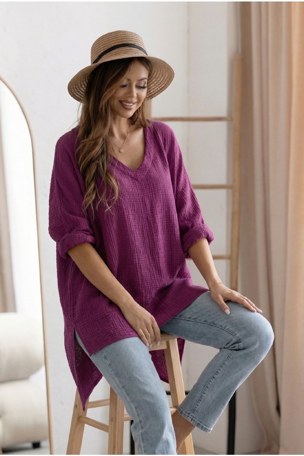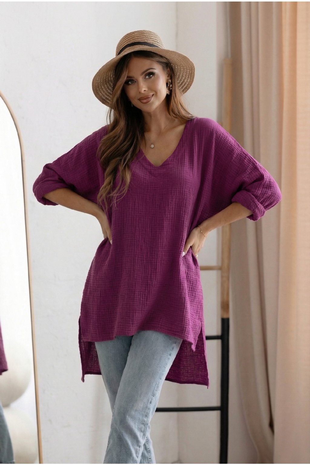 Objevte naši dámskou mušelínovou tuniku s oversize, volným střihem, která vám poskytne maximální pohodlí a styl. Zadní strana je o něco delší než přední, což přidává moderní vzhled. Výstřih do V dodává tunice elegantní nádech. Vyrobeno ze 100% bavlny, ideální na plavky nebo jako top k džínům. Perfektní volba pro letní dny plné pohody a elegance.