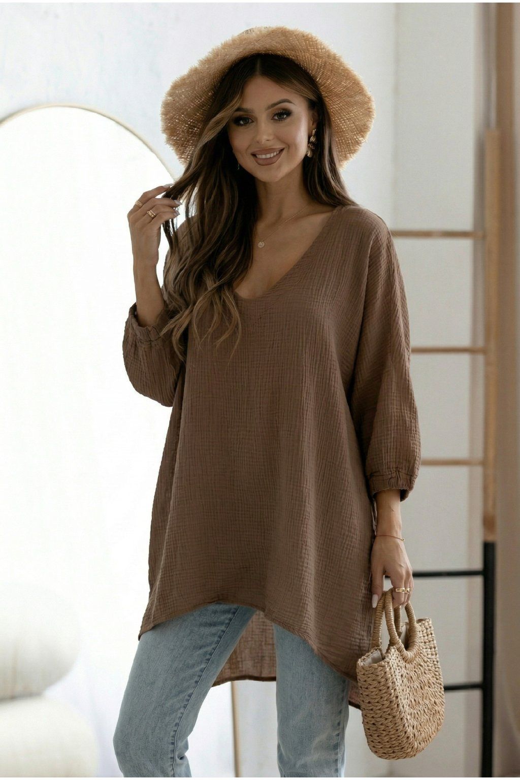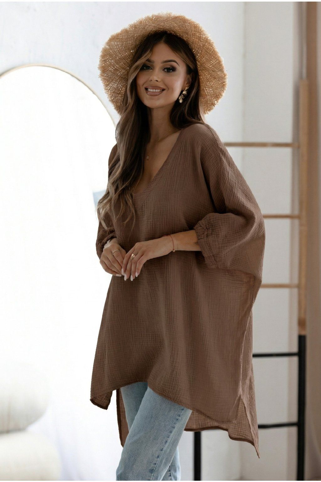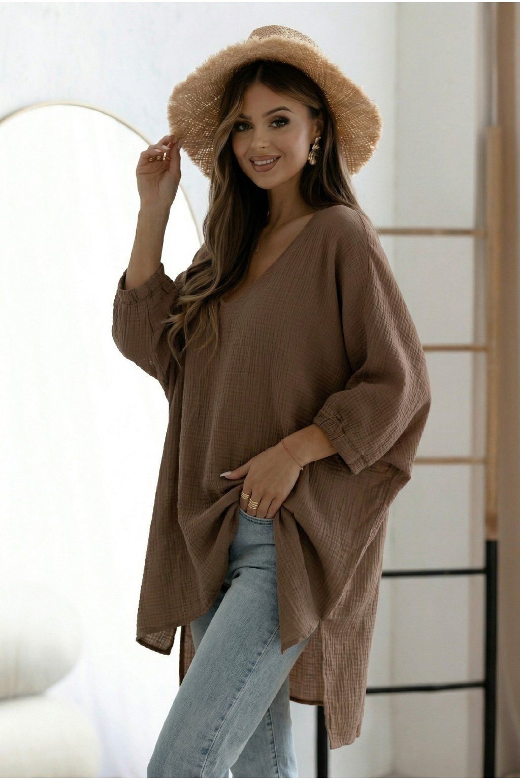 Objevte naši dámskou mušelínovou tuniku s oversize, volným střihem, která vám poskytne maximální pohodlí a styl. Zadní strana je o něco delší než přední, což přidává moderní vzhled. Výstřih do V dodává tunice elegantní nádech. Vyrobeno ze 100% bavlny, ideální na plavky nebo jako top k džínům. Perfektní volba pro letní dny plné pohody a elegance.
