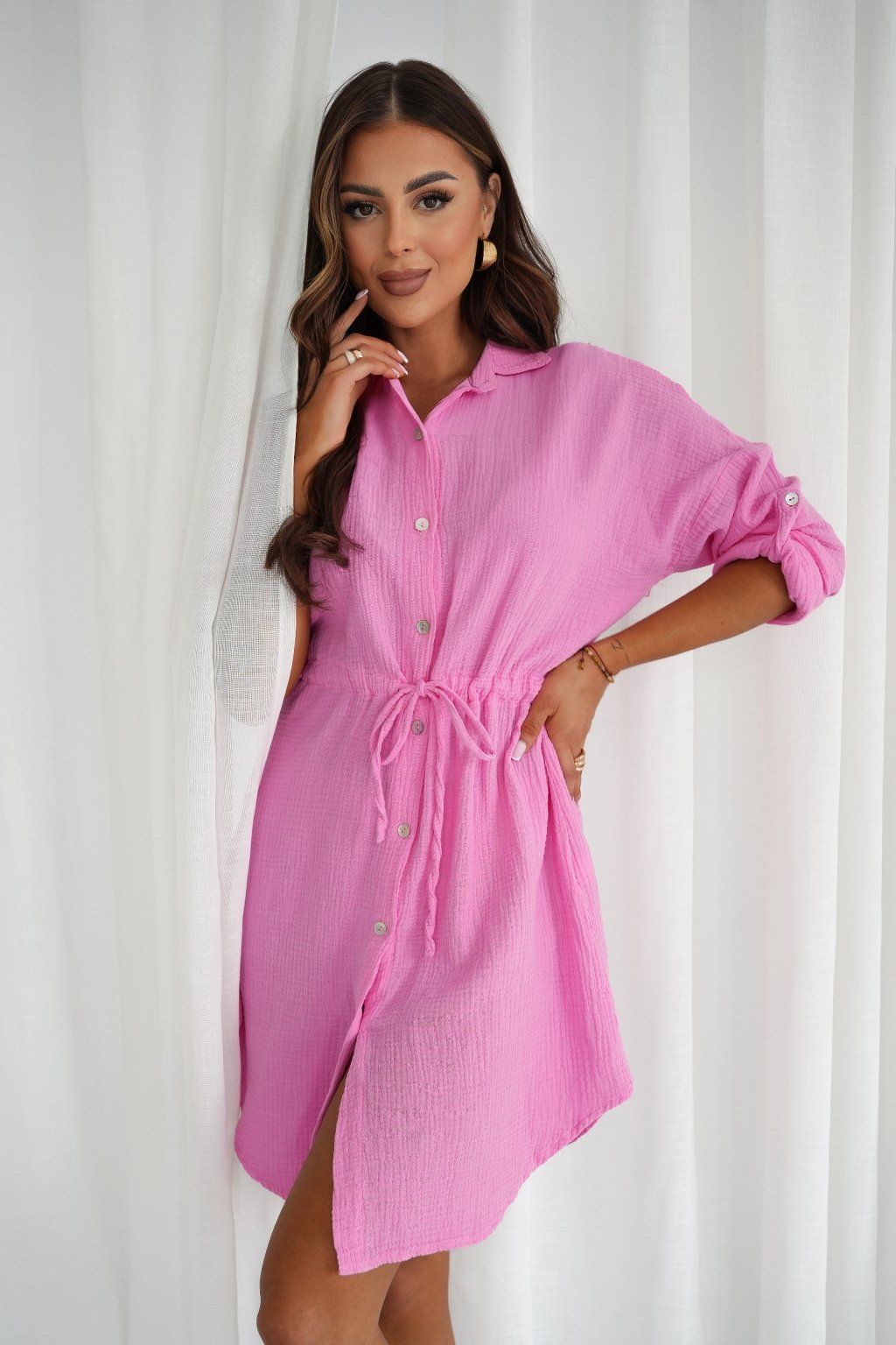 Objevte pohodlí a eleganci s našimi mušelínovými šaty Viola košilového střihu. Šaty sahají nad kolena, mají zapínání na knoflíčky a v pase je lze stáhnout pomocí tkaničky pro perfektní siluetu. Praktické 3/4 rukávy jsou stylově ohrnuté. Vyrobené ze 100% bavlněného mušelínu, jsou lehké, prodyšné a ideální na teplé dny. Decentní vykrojení na bocích dodává šatům moderní nádech. Skvělá volba pro každodenní nošení i volný čas.